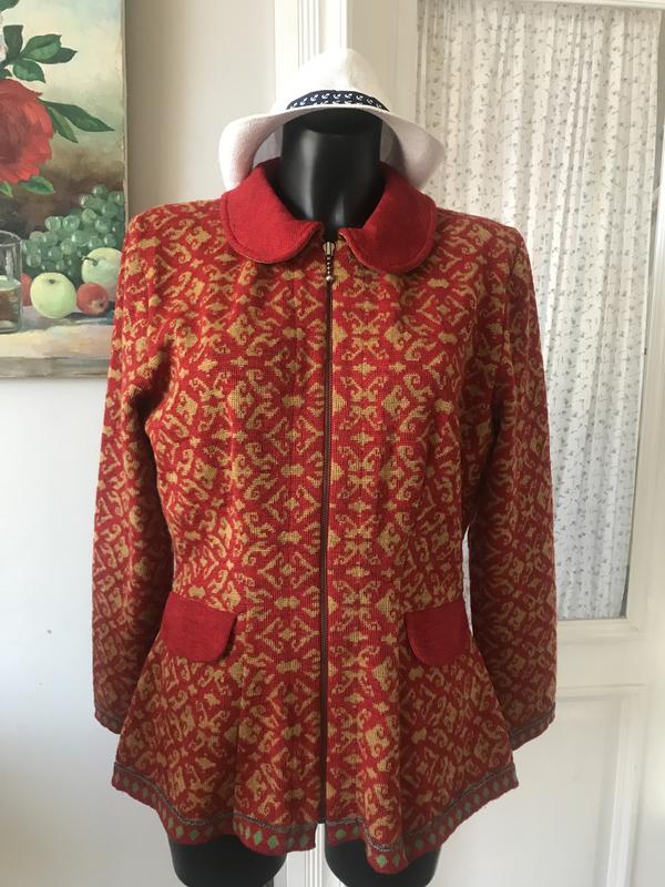 Очень красивый шерстяной вязаный жакетик Германия. Приталенный, застежка-молния металлическая, два кармана-клапана, без подкладки. Красивый узор, . Не тонкий, тёплый. Состав:шерсть-100/. Размер по бирке-М. Замеры:длина-67 см, ПОГ-50 см, ПОТ-42 см, РОБ-58 см, рукав-60 см. Есть нюанс:на плече по спинке есть спущенная петля(обнаружила еетолько напросвет, полотно цветное, совершенно не видно). Нужно аккуратно подтянуть. -учтено в цене изделия