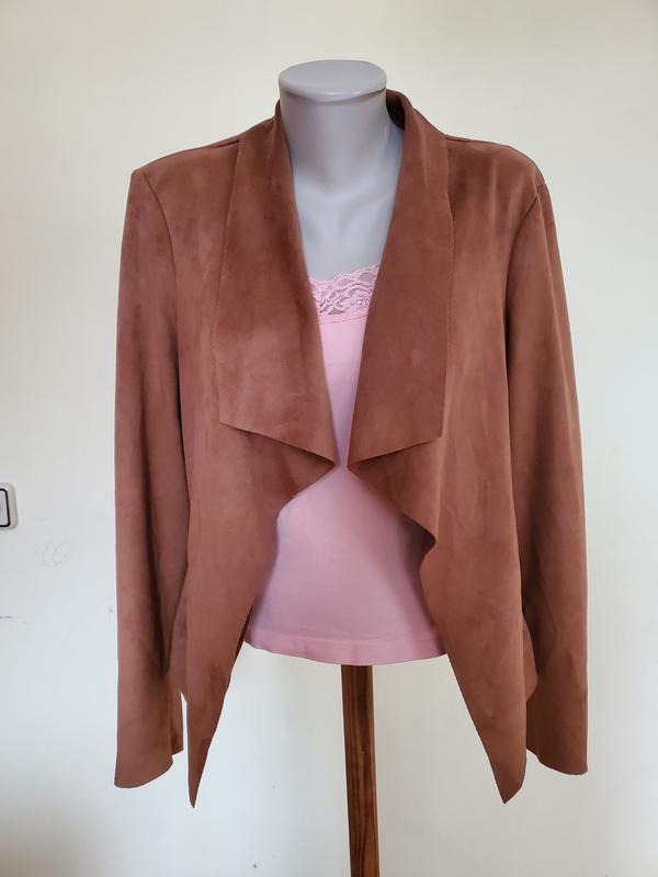 Классный жакет из мягкой, приятной к телу ткани, есть боковые карманы, без застёжки.ПОГ 49, ПОТ 44, ПОБ 51, плечи 46, рукав 63, длина 57 см.