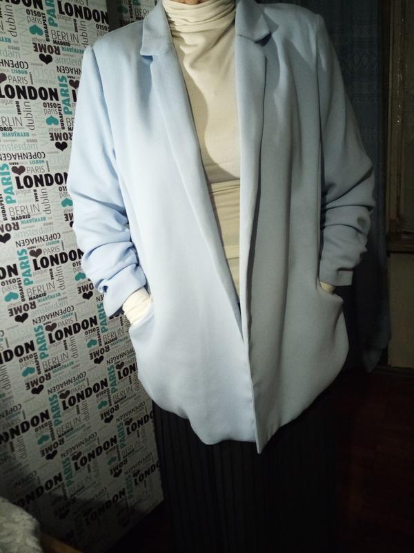 из светло голубой шелковистой ткани. отличный крой. увеличена линия плеча. прямой силуэт. дефектов и изъянов нет.(есть внутри на подкладке ткани по швам по бокам две зашитости последнее фото ) сделаю дополнительно фото и нужные вам замеры. фото при искусственном освещении в употреблении был пару раз на торжество и висит в шкафу на плечиках) родом из 2000х можно стирать в машинке на деликатном режиме. сушить на плечиках и утюжить через марлечку на рост до 170 см.ПО груди 56 см. прямой ПО бедра 56 см.Длина по спине 67 см. шлица 15 см Длина рукава 50 см плечо 13 см на рост 170( модель на фото рост 164см) пересылка Новой почтой после оплаты отвечаю в течении суток. пересылаю на следующий день после оплаты Новой почтой