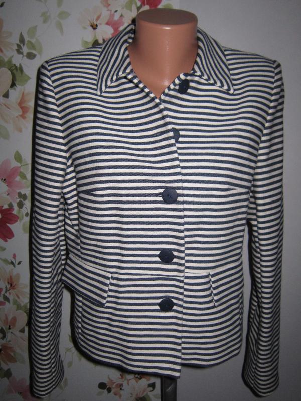 Красивое благородное сочетание цветов. Жакет на подкладе. Ткань плотная, не тянется. Клапаны - имитация карманов. Сзади немного присборен в талии. Длина - 55, ДР - 61, ш.плеч - 37, ПОГ - 47. Верх - 85% хлопок, 10% полиэстр, 5% вискоза. Подклада - полиэстр, вискоза Фото на теле нет. Резерв на время оплаты – 1 день. Оплата - на карту ПриватБанк. Отправление на следующий день после оплаты (кроме праздничных и выходных дней) Новой почтой, Укрпочтой - оплата доставки при получении. Возможен наложенный платеж при предоплате в размере стоимости доставки в 2 стороны.