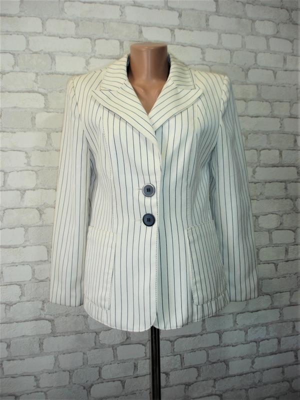 Белый пиджак в полоску с карманами "TREVIRA " 100% viscose (67% polyester 33% viscose -подкладка) размер не указан (на наш 46- 48 р) Смотрите в сантиметрах в моем описании ШИРИНА ПЛЕЧА 40 см ПРОЙМА 24 см ПОГ 47 см ПОТ 42 см ПОБ 52 см ДЛИНА РУКАВА от горловины 70 см((от линии плеча 57 см) ДЛИНА СПИНКИ 63 см состояние новой вещи сток
