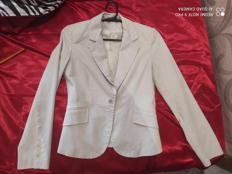 Белый пиджак в серую полоску, без дефектов, размер М. Плечи 36,5 см, длинна рукава 60 см, ПОГ 43 см, длинна 60 см. Есть карманы. Перешлю по Украине НП, укрпочтой. Возврат не предусмотрен.