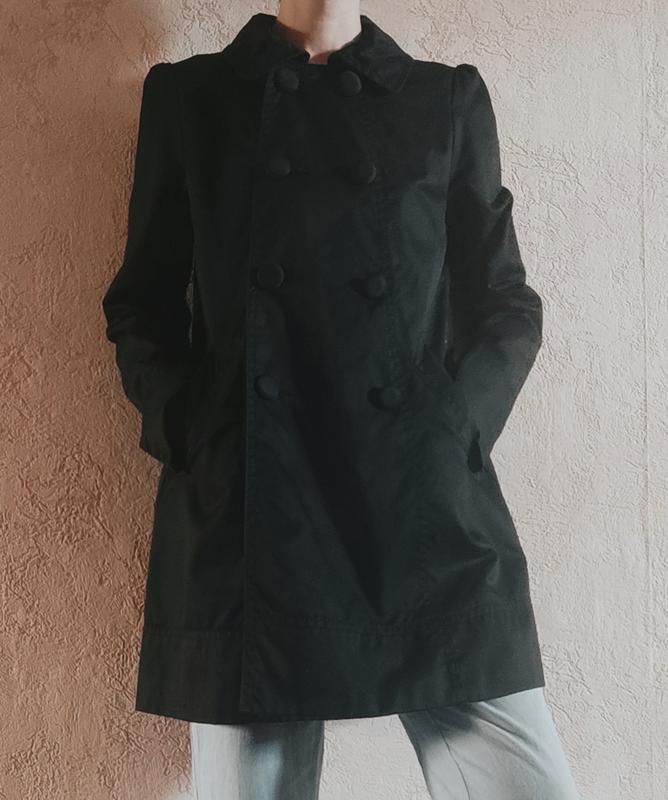 Лаконічний чорний плащ. Виконаний дуже якісно. Гудзики обтягнуті тканиною ( є запасні). Стан ідеальний. Підійде вагітним