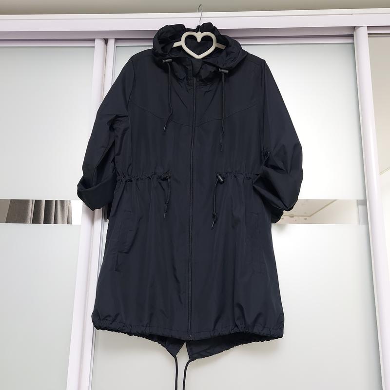 Якісний і дуже легкий плащ-вітровка. На талії і по низу стягується шнурком. Дефектів немає. Стан ідеальний.