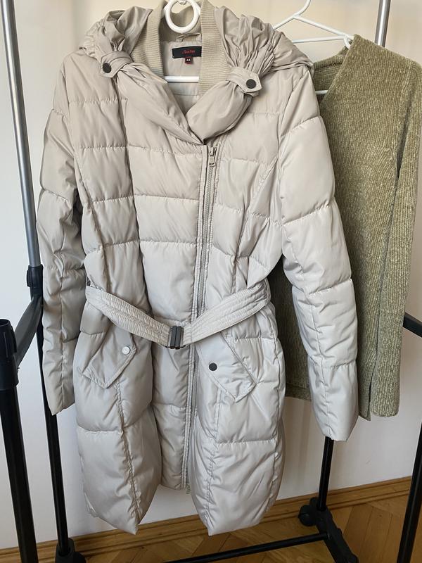 В ідеальному стані. Оригінальний дизайн капішона, можна пристебнути на застібку. (на фото видно, додала) Є кишені на кнопочках. Довжина - 89 см Рукав від плеча - 62 см Плечі - 40 см Пог - 52 см Фарба на замочках в ідеальному стані без полущень. На ремні металева застібка.