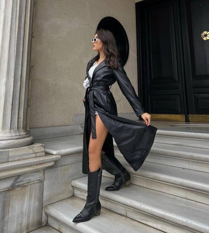 Тренч из экокожи Код uu 157 Ткань: матовая экокожа, без подкладки Размер: 42-46 Универсал Цвет: черный Цена 899 грн Базовая вещь в твоем гардеробе😎 С ремешком. Застегивается на пуговки. Сзади небольшой разрез. Также есть кармашки.