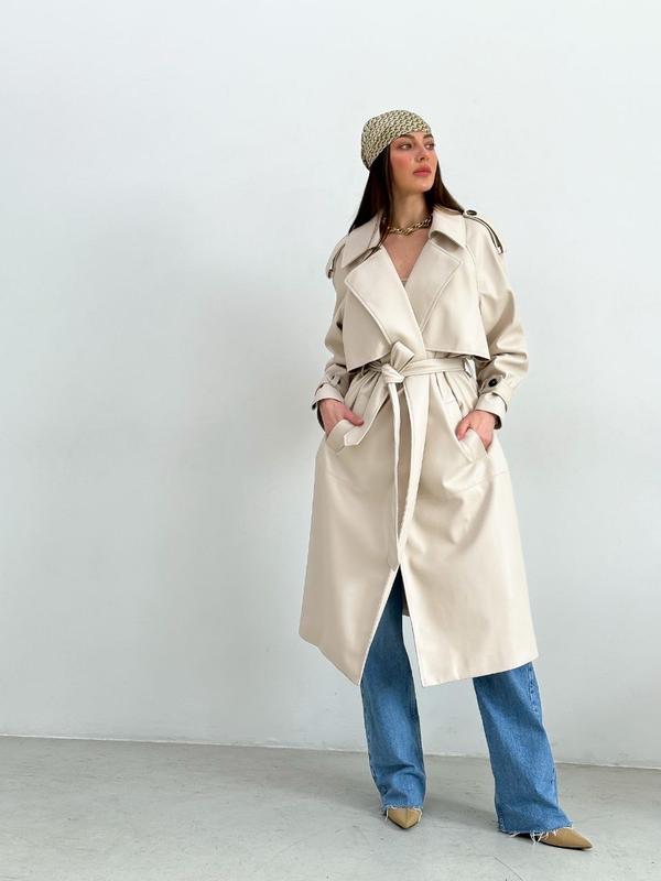 Тренч плащ кожаный из искусственной эко кожи матовый длинный черный бежевый с подкладкой п...