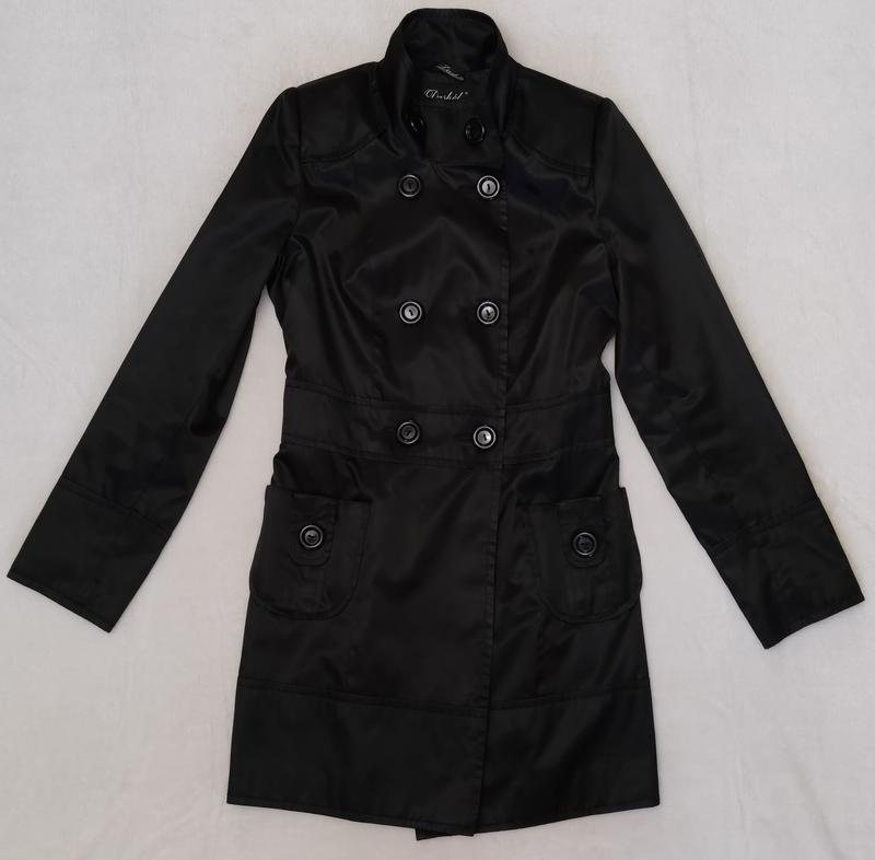 Двубортный плащ с воротником стойкой. Приталенный, красиво подчеркивает фигуру. Есть пояс. Длина 82 см Плечи 36 см Рукав 64 см Полуобхват груди 47 см Талия 39 см Стегна 54 см