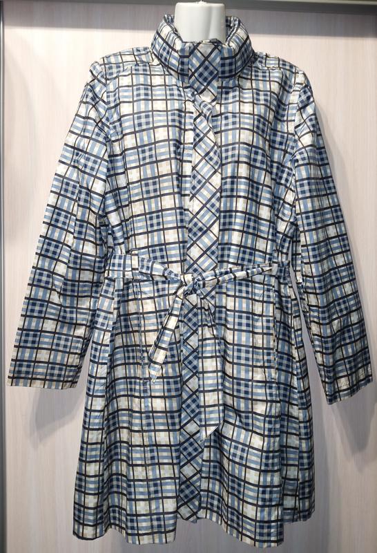 плащ в клетку, на молнии, дополнительно липучки, есть два кармана, под пояс, есть капюшон, который прячется в воротник
