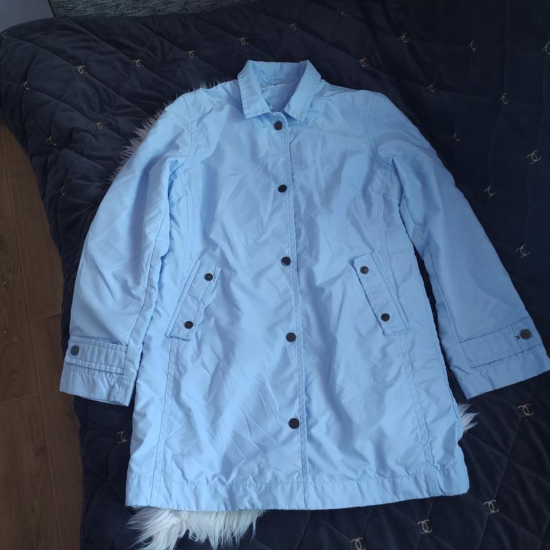 Плащ Tommy Hilfiger ніжного блакитного кольору. Дуже хороший стан без особливих нюансів. Кнопки трохи окислилися, треба добре відпарити, на воротнику є трохи кулькова ручка . Розмір xl . Заміри: Довжина 85.5 Рукав від плеча 64.5 Напівобхват грудей 56 Напівобхват пояса 51.5 Напівобхват стегон 57 приблизно 350 гр