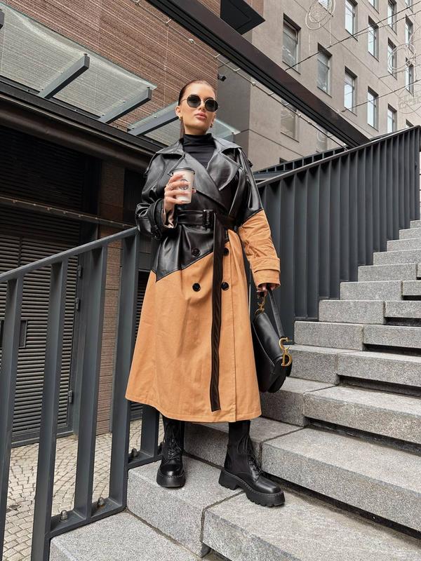 P 56 Комбинированный тренч из плотного коттона и экокожи На подкладке Размер : единственный 40-46