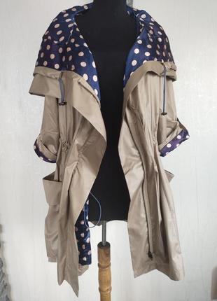 Плащ ветровая с капюшоном и карманами.На молнии.Размы S не большой M. довжина 80, рукав закатаний 37, напів обхват грудей 48, напів обхват стегон 62.