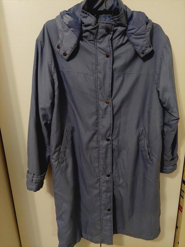 Деми пальто плащь голубой с капюшоном и карманами в отличном состоянии пог 62 поб 63 длина 104 рукав 59