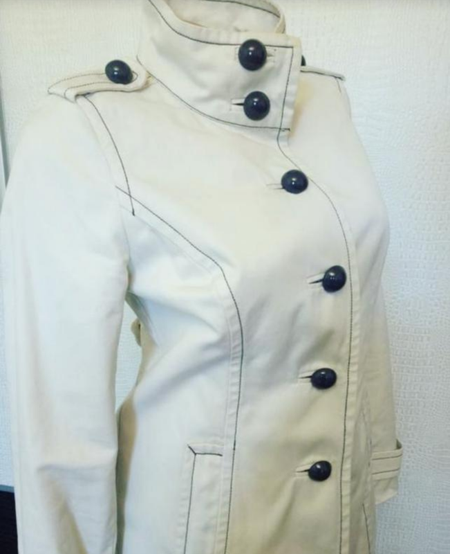 UK 8 42-44р. Цвет молочный. 100%cotton. Коттон плотный, как джинс. Подкладка из х. б. Длина по спинке 85см Плечи 38,5 см Рукав 62cm Ширина между подмышками 46,5 см Пот 43см Одягала мало. Без дефектов.