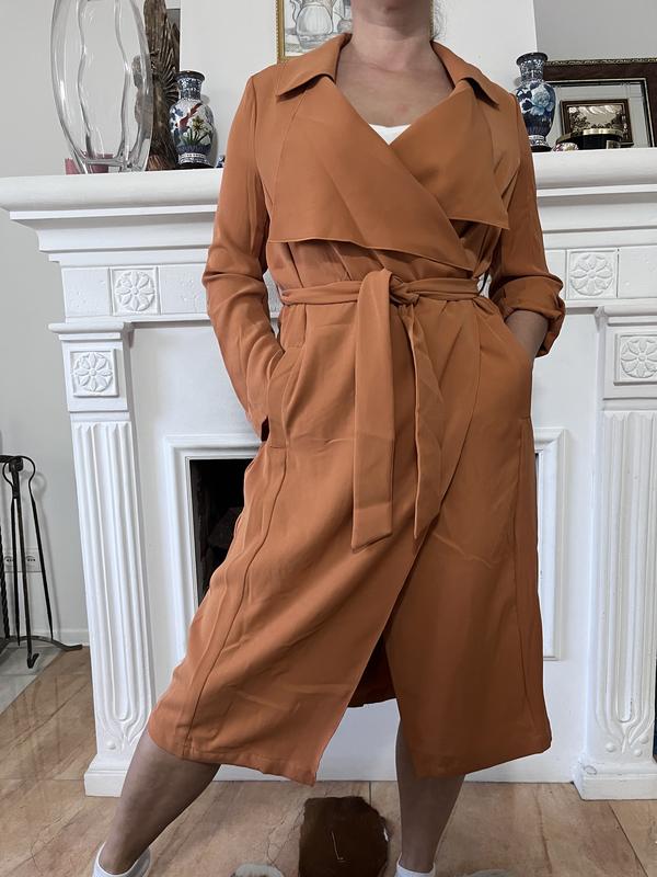 Сучасний тренч бренда Only з тканини гарного складу цегяного кольору. Двоборний крій, рукав реглан. Підкладка в тон, пасок, клапани, кишені. Розмір л,підійде см