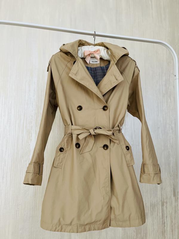 Крутой классический тренч от ZARA с капюшоном😍 Очень приятный на ощупь, на подкладке, по фигуре сидит красиво! Склад: 63% котон, 37% нейлон. Состояние идеал. Пишет ZARA Kids, однако, будет на С/небольшой М, лучше ориентироваться по замерам. Замеры: длина 79, талия 49, рукав от капюшона 70.