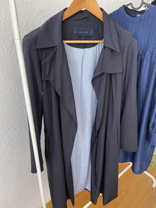 Женский плащ от Зара,на осень и весну,темно-синего цвета с переливом,под пояс без пуговиц