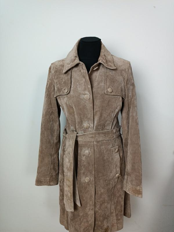 натуральный замшевый тренч,красивый цвет, без следов носки,новый без картонной бирки Пог 50 пот 48 длина 98 рукав 62 натуральная кожа