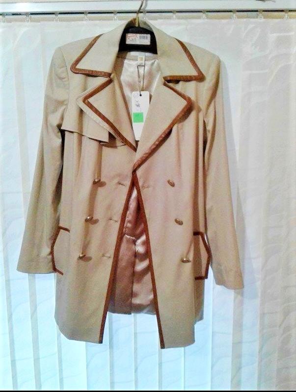 Очень красивый, стильный плащ, цвет кофе с молоком( тёплый насыщенный беж), оторочка коричневая, на подкладке. Замеры: плечи 42, подмышки 50,рукав 62, длина 81.