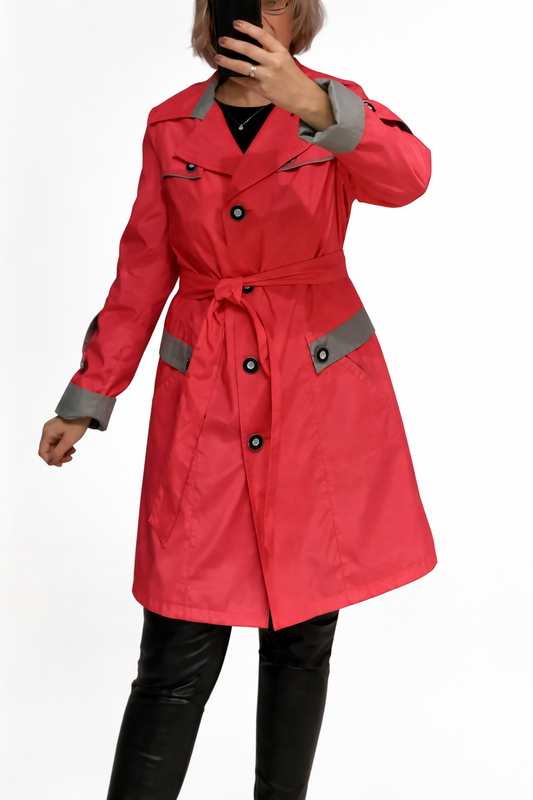 плащ тренч яркого лососового цвета. ткань плащевка. имеет акцентные вставки в черно белую мелкую клетку. застегивается на пуговицы. на подкладке. с подплечниками. имеет пояс при рости 162 см. до колена.