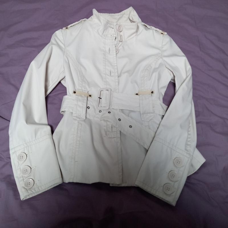 Очень красивый плащ молочного цвета. 100 % бавовна. Качественный пошив. Но есть недостатки - вставки из кожума потрескались. Все остальное в идеале.
