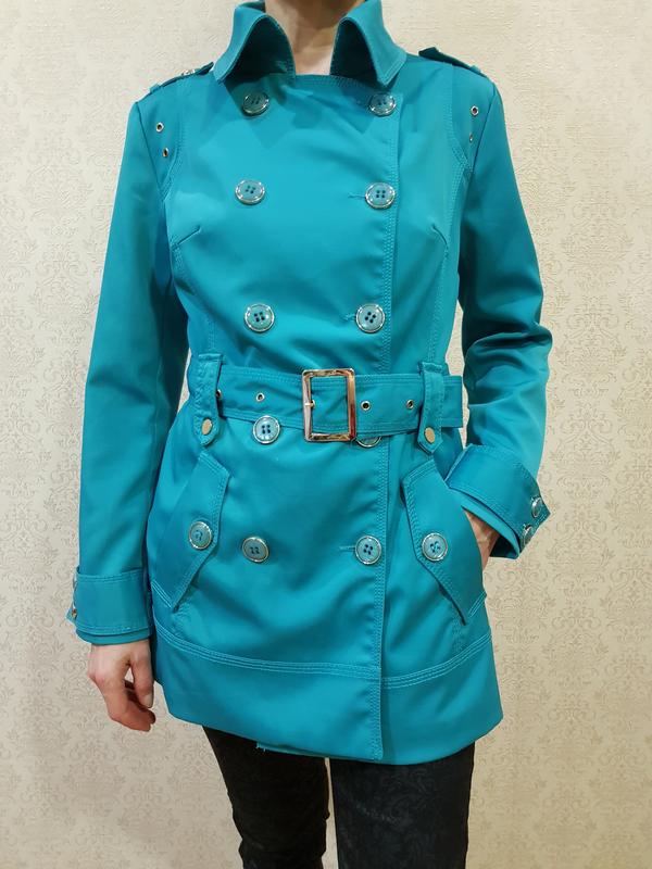 Бірюзовий двобортний тренч, тканина водовідштовхувальна, на підкладці, розмір М, у чудовому стані, заміри на фото