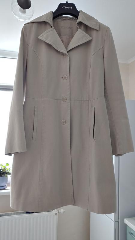 Тренч у чудовому стані. Одягався декілька разів. Гарний крій. Красиві прострочки. Довжина міді. На зріст 162см мені до коліна. Трішки приталений, не занадто, а лише щоб підкреслювати фігуру. Дуже гарна текстура тканини. Верхня тканина -- 100% бавовна + підкладка поліестерова. Розмір вказаний 38R Носила на параметри ОГ 86см, ОТ 70см, ОБ 92см На ці параметри трошки вільно, тому можна брати на більші. Є мікро-ньюанс: зі зворотнього боку, де шліца, 1.5см вручну зашитий розпущений шов. З зовнішньої сторони абсолютно не видно і ніяк не впливає.