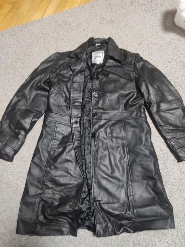 Кожаный плащ с подкладкой в хорошем состоянии. Надевался 1 раз. Есть потертость, которая образовалась из-за длительного хранения.
