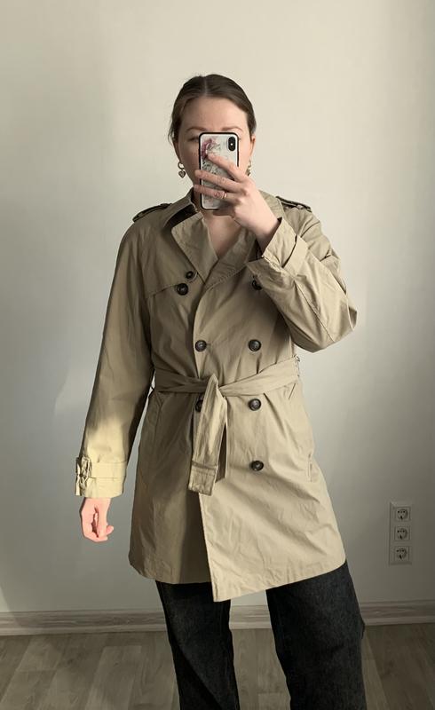 Тренч бежевого кольору Розмір 40 У складі 92% катон, 8% поліестер Довжина 87 см, довжина рукава від горловини 74 см, напівобхват грудей 52 см, напівобхват стегон 54 см Відсутня бляшка на паску, стан ідеал Вдягнуто на розмір Л, зріст 167