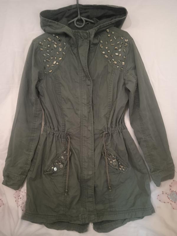 Плащ-парка цвета хаки на трикотажной подкладке серого цвета декорирован блестящими стразами в тон ткани застегивается на молнию и кнопки капюшон не отслеживается по талии регулируется Длина по переду 77 Длина по уду 86 Длина рукава 60 НПОГ 48 НпОС 52