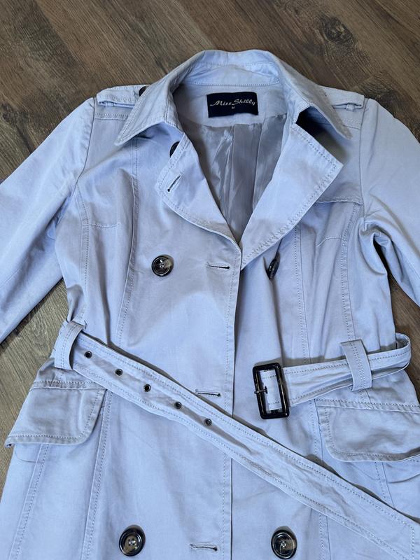 Плащ серого цвета, до колена длина, на бирке указан М, но на S лучше подходит