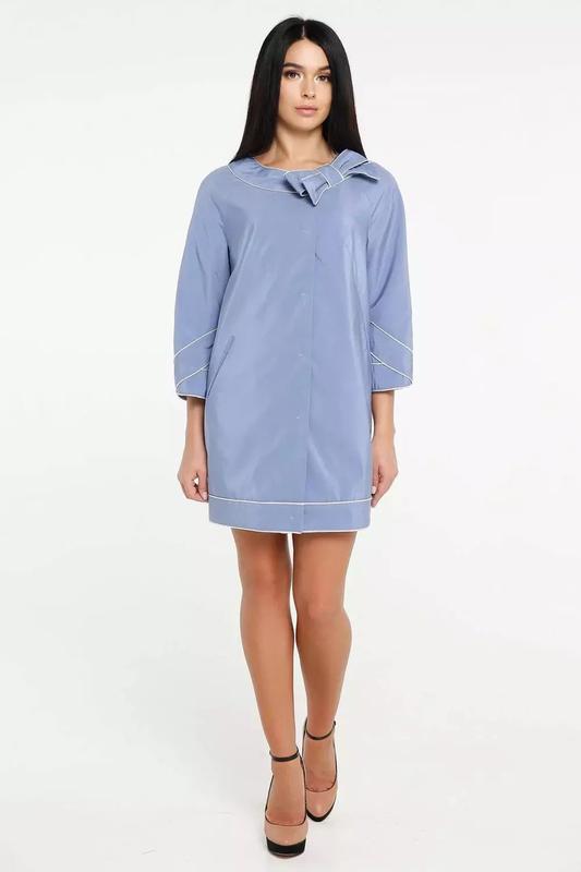 Плащ женский весенний, выполнен из плащевой ткани, прямого силуэта с цельнокроеными рукавами. Изделие без воротника с бантом. Подкладка 100% нейлон Плащ декорирован подрезами, отделочными кантами Карманы – щелевидные Застежка смещенная на шесть кнопок Длина рукава 65 см Длина изделия по спинке 80 см