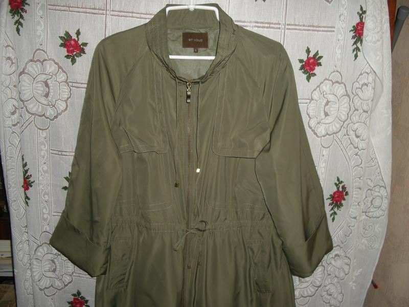 Шикарная ветровка -плащ красивого зеленого цвета с блестинкой,фирменная,застегивается впереди на замок-молнию с золотистыми собачками,воротник-стойка стягивается на шнурок,талия на резинке-стягивается на шнурок,впереди на груди и сзади на спине красивые складки,объем груди-122см.,впереди внизу два косых кармана,рукав длиной-64см.от шеи заканчивается широким манжетом,длина пальто-94см.