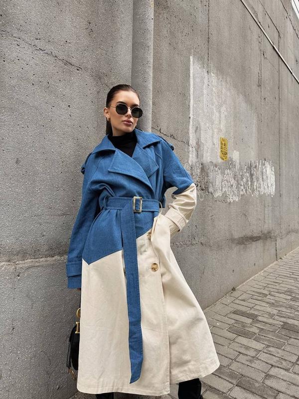 Комбінований тренч з плотного котону та джинсу На підкладці Розмір : єдиний XS-L Заміри : Рукав від горловини 75 см Довжина 115 см Груди 100 см Талія 90 см Стегна 113 см мод 12.8шд