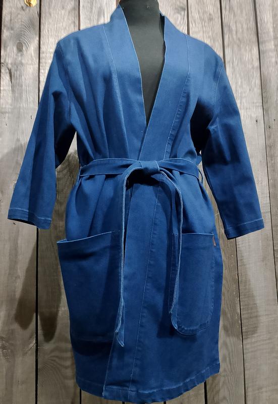 легкий плащ или пледник из джинсовой ткани на запах. с кошенями.стан великолепен. джинс плотный и эластичный.стан идеален.