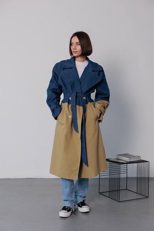 Ярким трендом сезона 2024 года стали комбинированные двухцветные джинсовые плащи в контрастном сочетании. ⚜️Мод. 554 ⚜️тканина. джинс 💯 ⚜️размер.универсал ⚜️цвет.песок / джинс замеры грудь 120 длина 114 рукав с плечом 76 стегна 128 #плащ #джинс #одеса #накладной_платьеж #brand_587