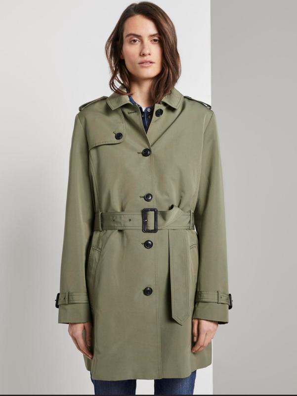 Плащ с отложным воротником, закрывается на пуговицы и пояс. Два прорезных кармана, манжеты на рукавах. На подкладке.