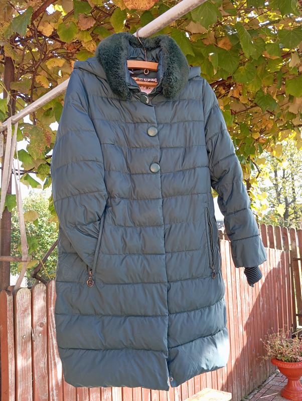 зимовий плащ жіночий, зеленого кольору розмір ХЛ має хутро,воно знімається Застібається на кнопки і замок має трішки потертості на гудзиках
