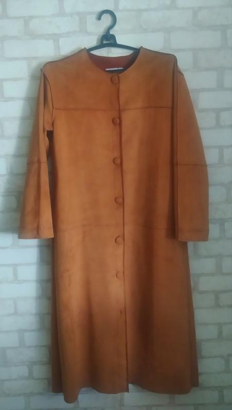 Плащ из ткани имитация замши.Колир кэмэл,нажаль фото не передает 100%цвет.Плащ очень стильный,меет карманы в боковых швах. Без подкладки.Зуммеры пог50см,пос 54,длалина 118см.Стан новой вещи. Сделано в Турции