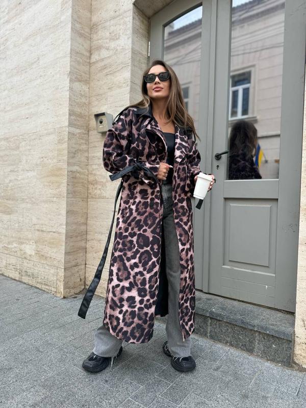 Невероятно стильный трендовый ТРЕНЧ 🧥 .Выполнен из ткани Бондинг - является плотной двухслойной тканью, очаровывает от ветра и дождя, она не пропускает холод и не промокает. ⚜️мод.590 ⚜️ткань:бондинг, эко-кожа (подкладка мини твил) ⚜️размер.универсал ⚜️цвет.принт Лео грудь 120 рукав с плечом 74 стегна 124 длина 122