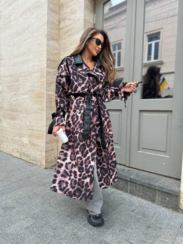 Невероятно стильный трендовый ТРЕНЧ 🧥 .Выполнен из ткани Бондинг - является плотной двухслойной тканью, очаровывает от ветра и дождя, она не пропускает холод и не промокает. ⚜️мод.590 ⚜️ткань:бондинг, эко-кожа (подкладка мини твил) ⚜️размер.универсал ⚜️цвет.принт Лео ⚜️ціна. 2100 грн грудь 120 рукав с плечом 74 стегна 124 длина 122