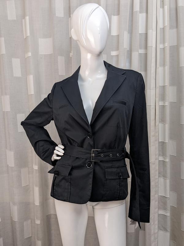 Укороченный тренч черного цвета. Имеет накладные карманы и пояс. Имеет V-вырез и классический воротник. Имеет подклад и вытачки на талии и пуговицы черного цвета. Плечи имеют паролоновые подкладки. Материал- хлопок Цвет- черный Размер- L Замеры (см) Пол об. плечи- 41 Пол об. грудь- 49 Пол об. талия- 43 Пол об. бедра- 48 Длина от плеча- 58 Длина рукава-65 Состояние-10\10 №350