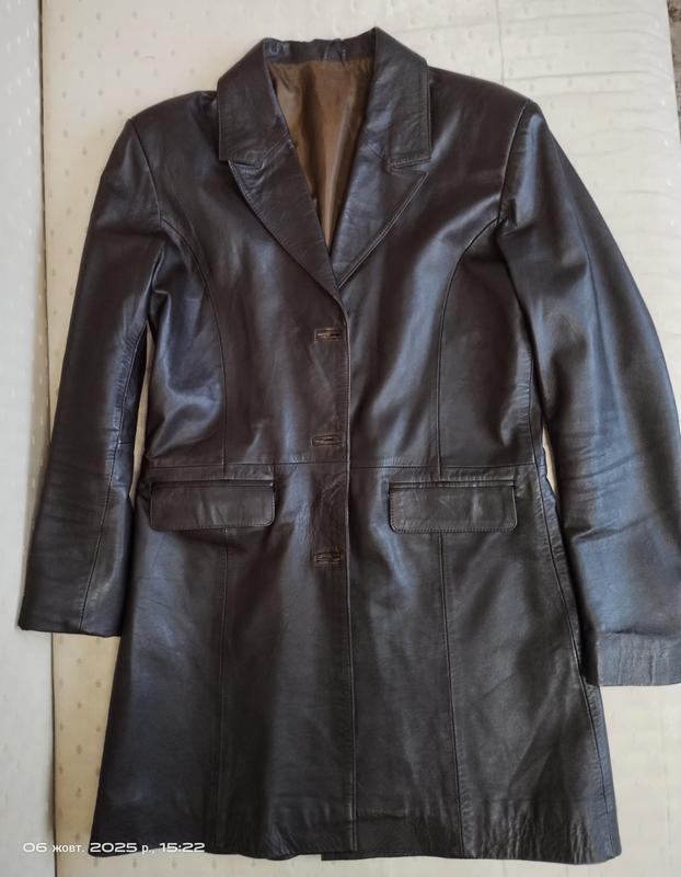 Шкіряний плащ с заниженою талією і карманами. довжина плаща 88 см, об'єм талії 94 см, об'єм по грудях 100 , довжина рукава 65см, в підгорнутому (як на фото)- 59 см.