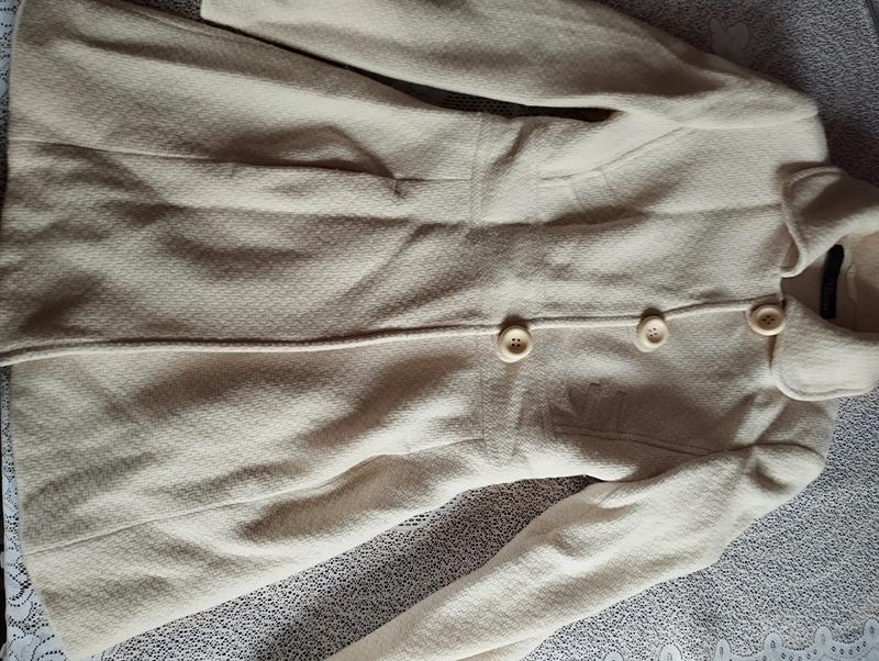 Короткий плащик, молочного кольору, склад 60% шерсть. Длина 80, плечи 40,грудь 44, талия 36, рукав 60