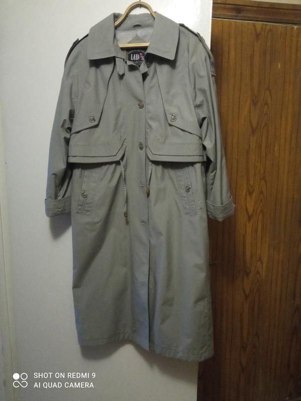 Плащ из натуральной плащевки, реально не промокает, приятного серого цвета. На плечах - лацканы, на поясе - кулиска- для регулировки объема, сзади - шлица, которая застегивается на пуговицу, глубокие карманы.
