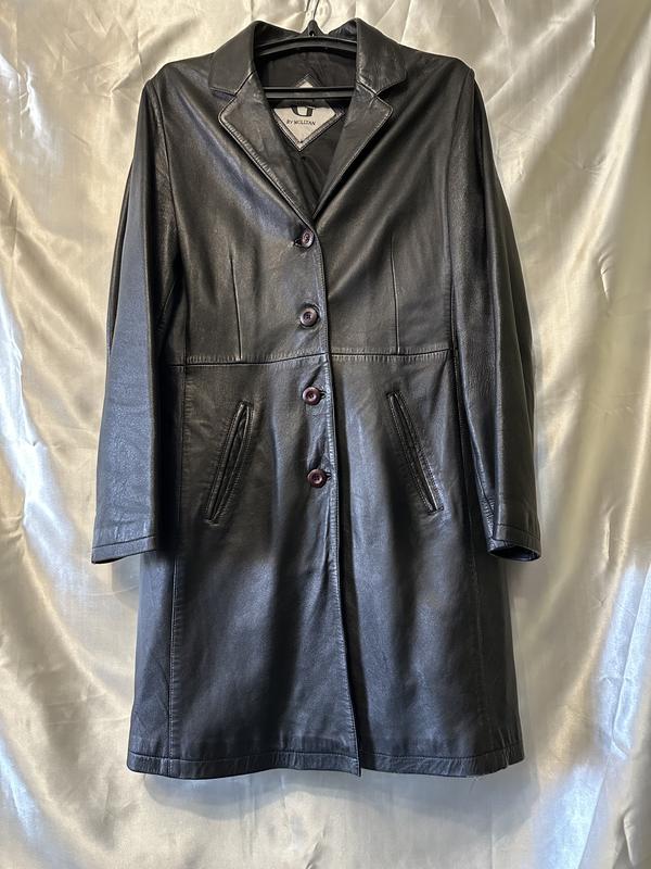 Плащ шкіряний Пів обхват грудей 50 Пів обхват талії 48 Пів обхват стегон 56 Довжина 95 Пів обхват плечей 43