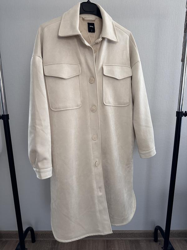 Куртка удлиненная, пальто легкое, тренч, р.S, молочного цвета, материал под замшу, накладные, прорезные карманы, легко будет стираться