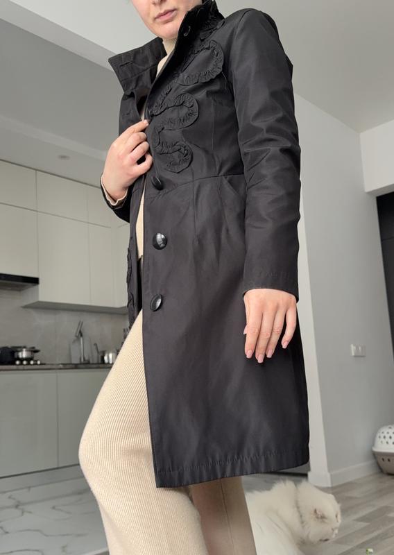 Плащ с пояском, черного цвета в хорошем состоянии. Тільки на нашивках десь не десь нитки висять. Вшитые паралоновые плечевые накладки. Размер 48. У плечах 40 см Под мышкой 46 см Талия 36 см полуобхват Длина 95 см Рукав по нижнему шву 49 см Рукав по верхнему шву 63 см