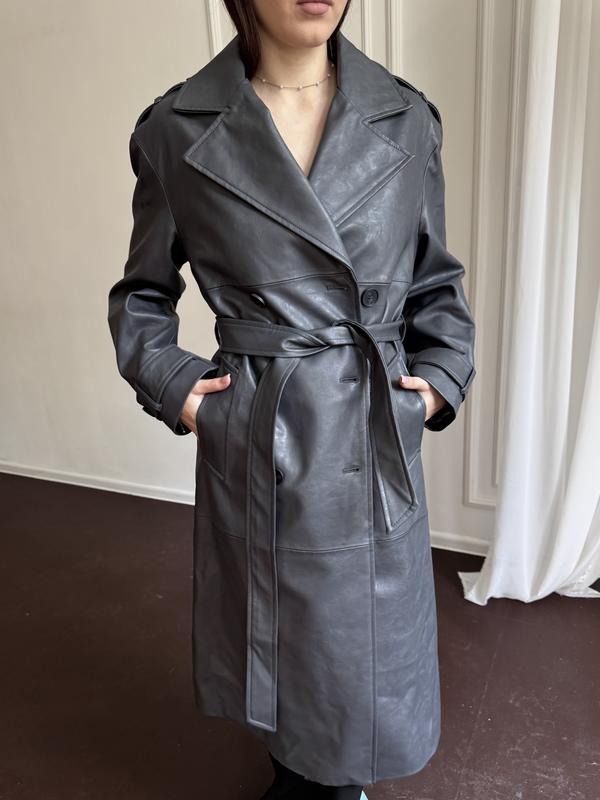 Плащ добре тримає форму Модель з екошкіри глибокого сірого кольору. Він має класичний фасон, із застібкою на ґудзики та поясом, який підкреслює талію Довжина нижче коліна
