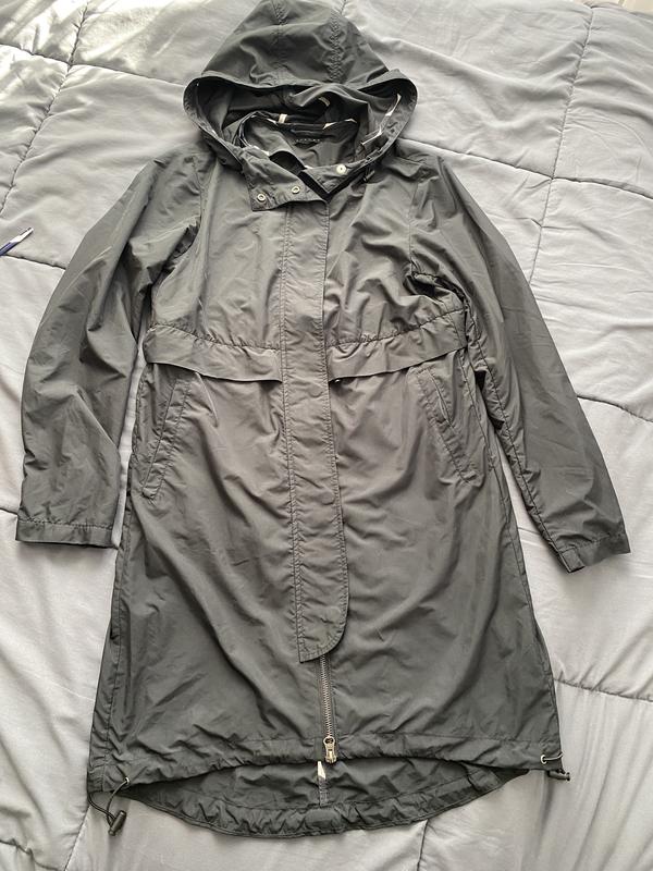 Гарний плащ,в чорному кольорі, на замку, з карманами, з регуляторами ширини на поясу, і внизу,з капішоном, на худеньку людину,напівобхват грудей47,довжина рукава 57,довжина 82,зад до 10 см подовжений